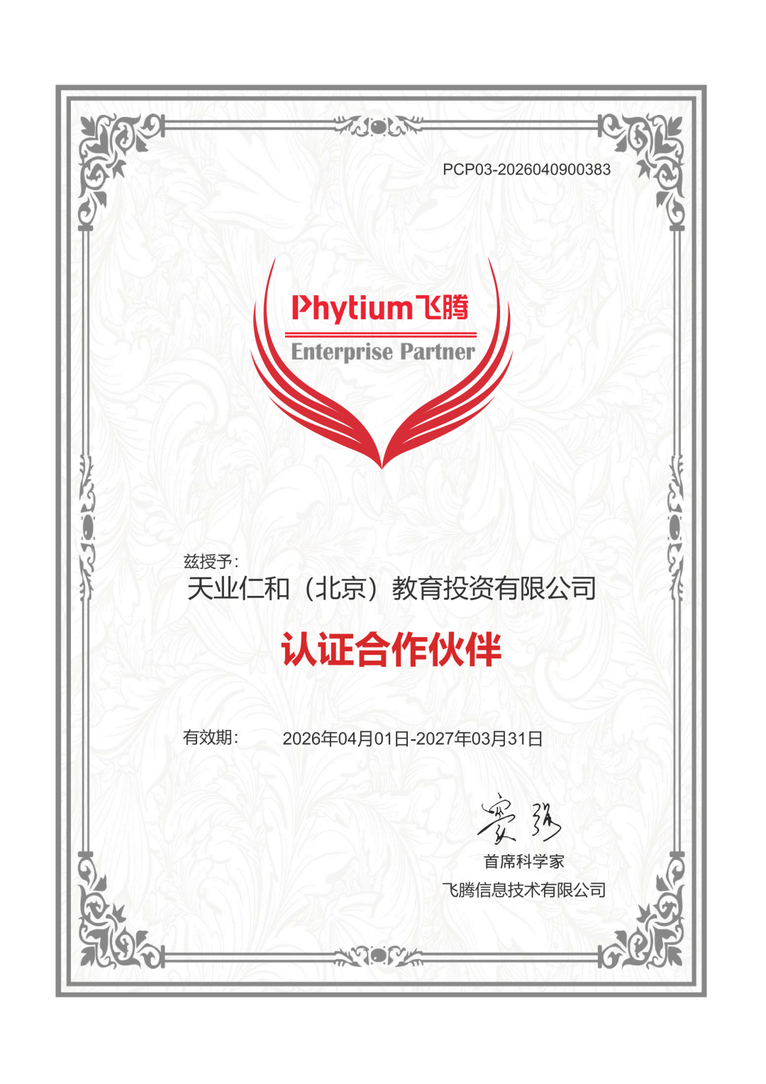 近日,天业仁和(北京)教育投资有限公司正式成为飞腾信息技术有限公司认证合作伙伴。