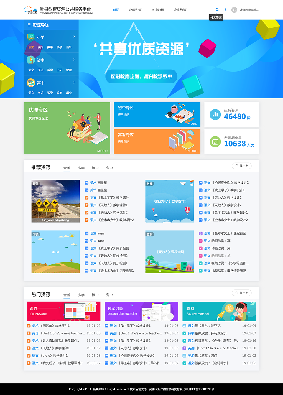 信息化技术飞速发展,中国的基础建设也在突飞猛进,而在为国家培养高精尖人才的基础教育行业面临巨大的资源不均衡现象,为了解决这一现象我们搭建教育资源公共服务平台,通过提供不同年级、不同学科、不同版本、不同章节的教案、课件、习题、素材,同时将所有资源展现在课堂上供教师现场授课,来解决县域无法获取最新资源的现状。利用互联网技术,研发教育资源公共服务平台更像是开凿水渠,引水灌溉。